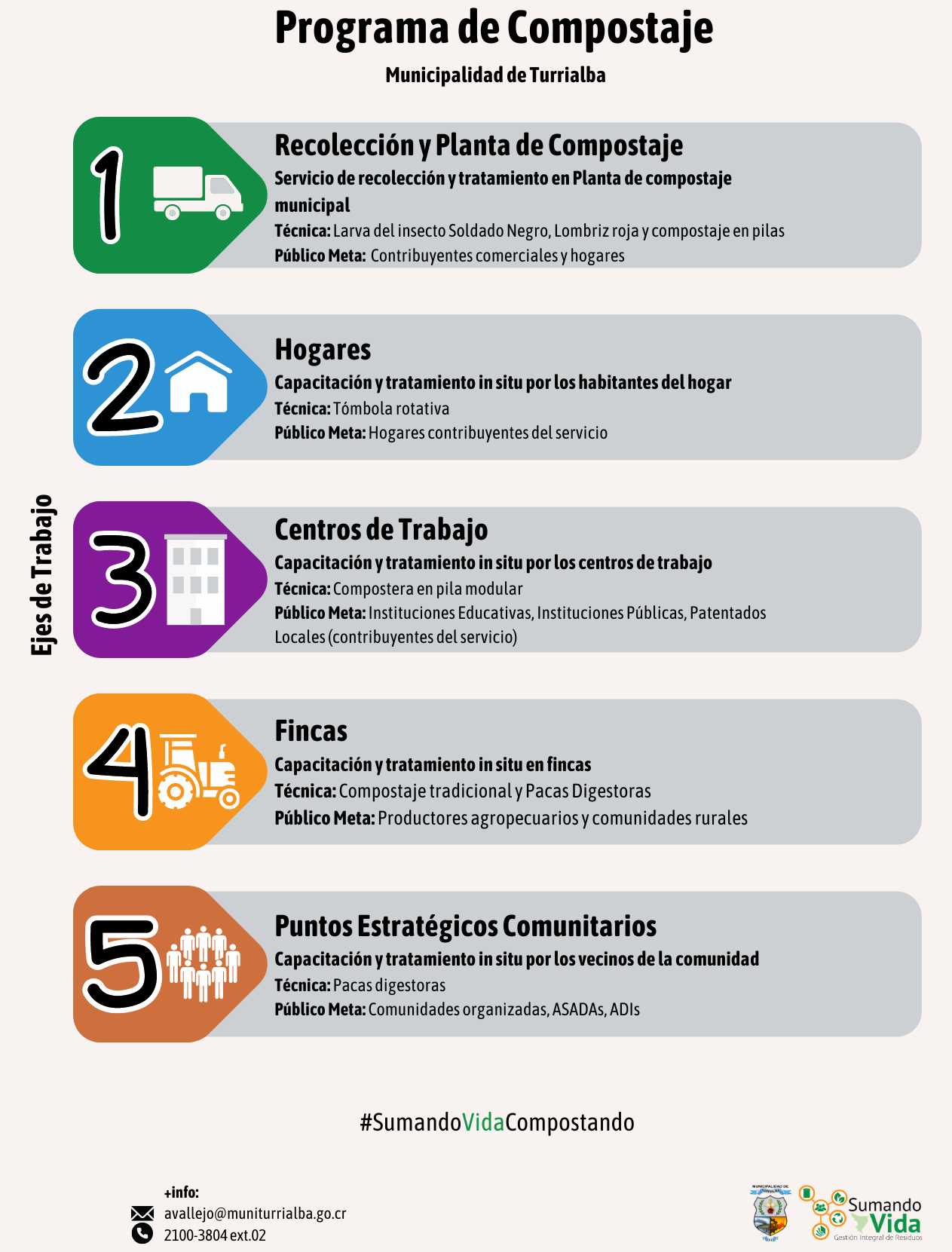 La Municipalidad de Turrialba cuenta con un Programa de Compostaje que se compone de cinco ejes de trabajo, que representan diferentes esfuerzos para lograr aprovechar al máximo estos residuos orgánicos, evitando que lleguen a relleno sanitario.
