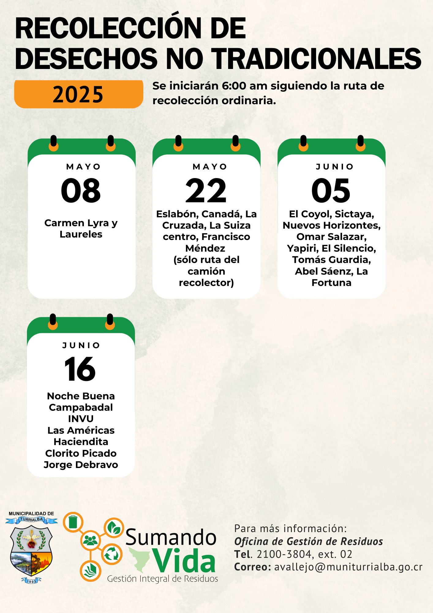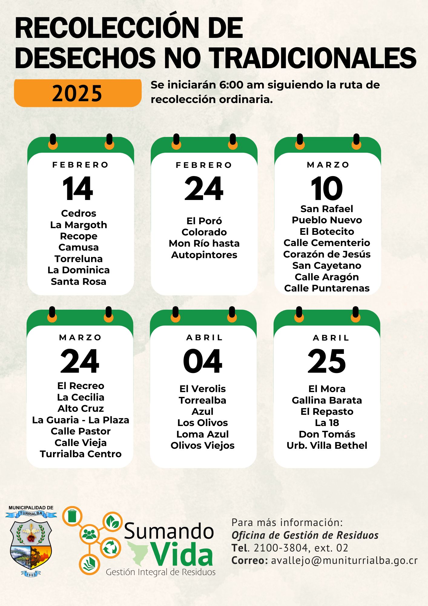 La campaña contempla jornadas de recolección durante los meses de febrero a julio del presente año. Este viernes 14 se iniciará con un recorrido que abarca las comunidades de Cedros, La Margoth, Recope, Camusa, Torre Luna, La Dominica y Santa Rosa.