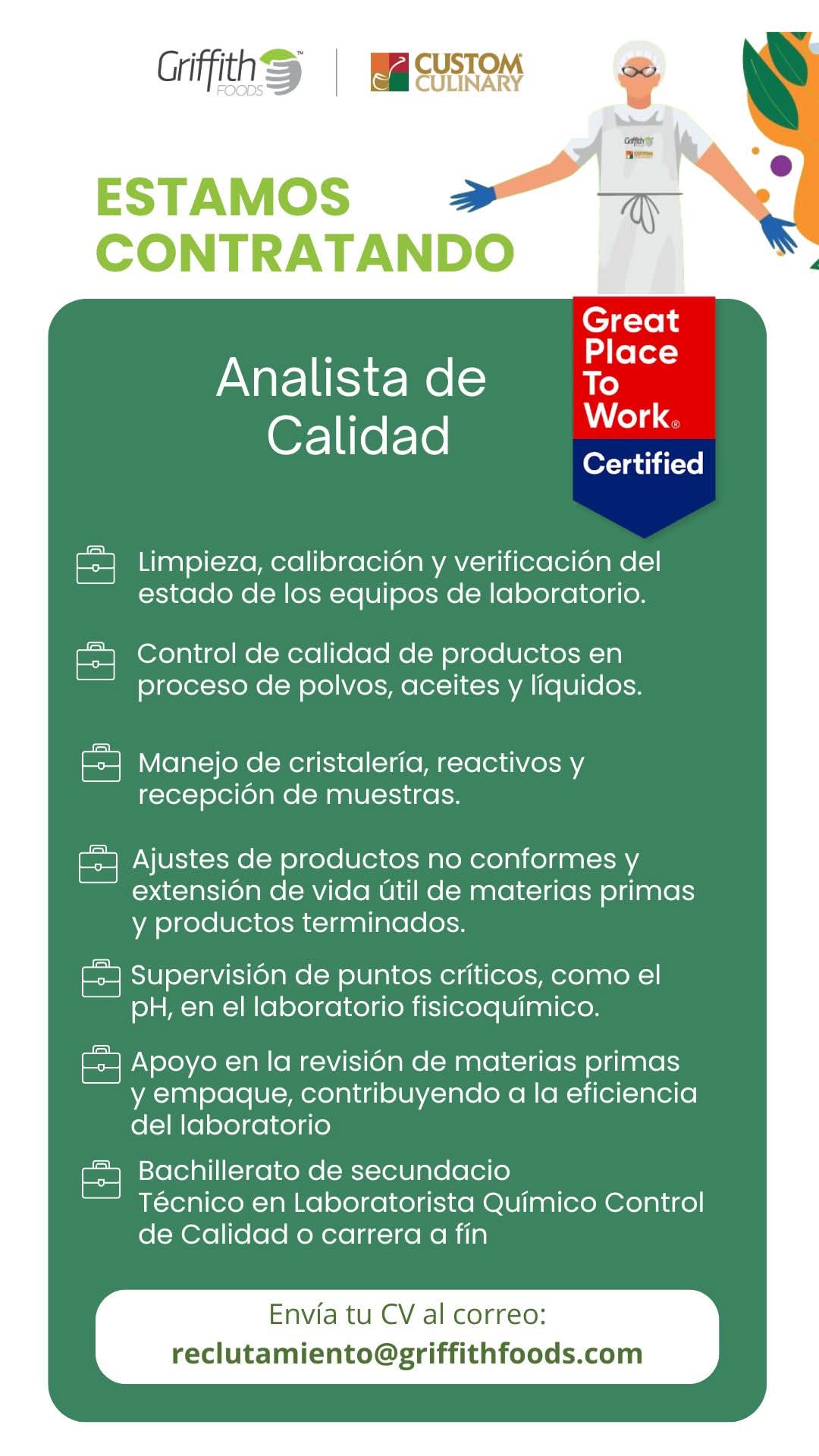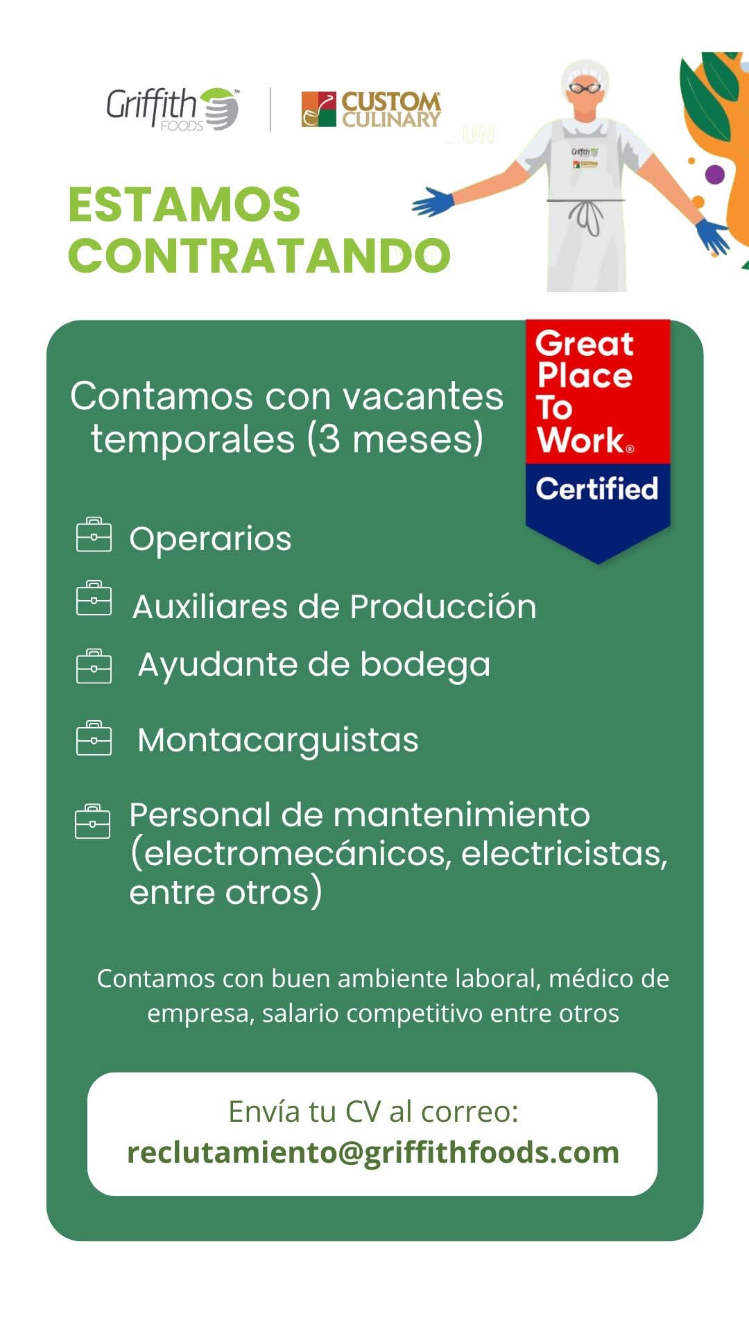 Empresa Griffith Foods tiene vacantes disponibles en puestos operativos en planta.