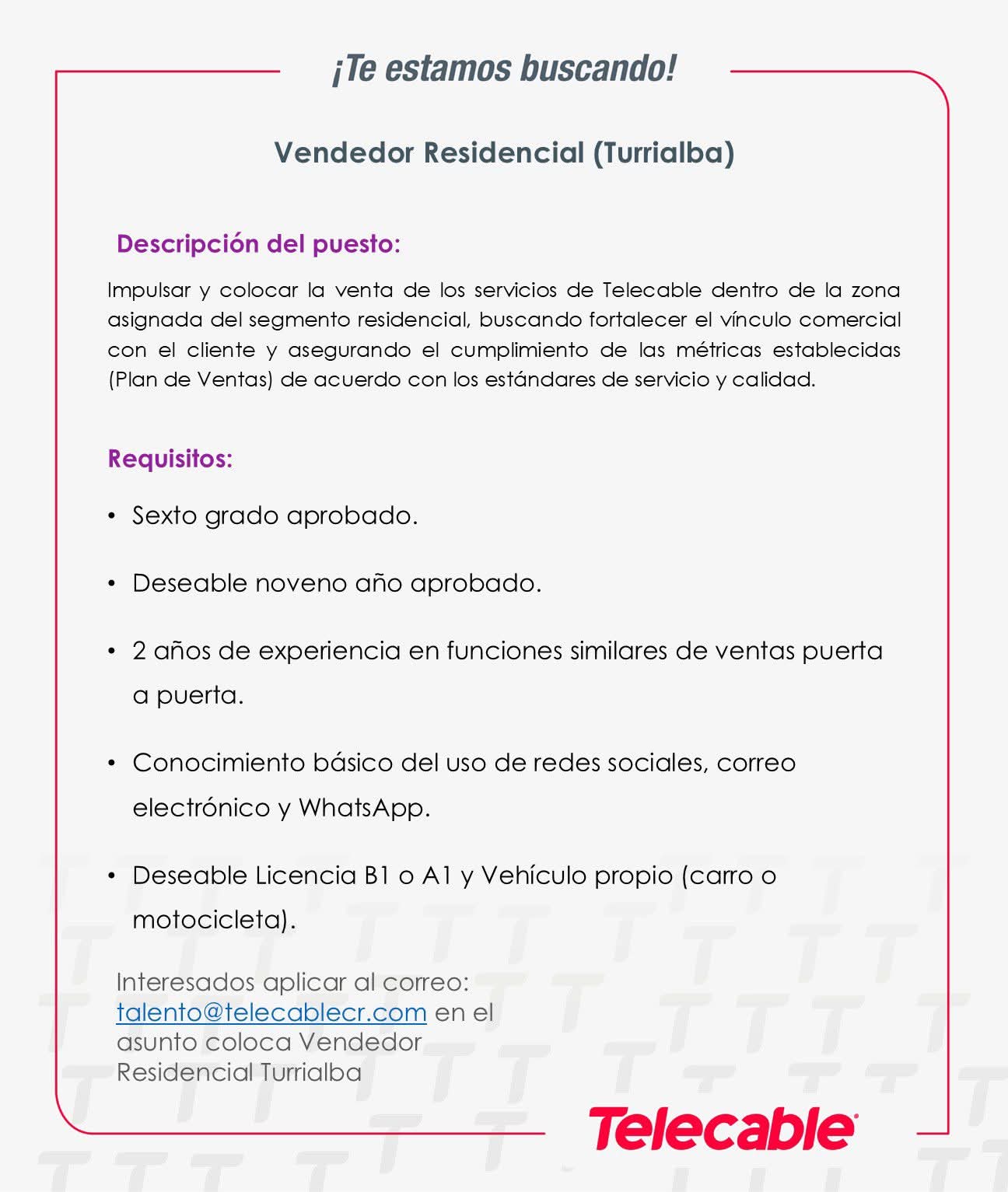 Telecable está impulsando el empleo en la zona de Turrialba y Cartago y tienen vacantes disponibles en este caso Vendedores Residenciales Puerta a Puerta.